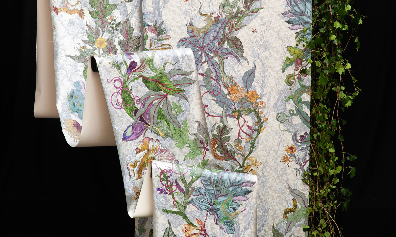 To celebrate their 35th anniversary, Timorous Beasties will present XL Jungle for Clerkenwell Design Week (20th – 22nd May 2025) at the brand’s London showroom on Britton Street. The dramatic 20m long wallpaper features a tropical inspired design that changes throughout the length. Digitally printed with an opaque white onto an embossed vinyl, the beautifully hand drawn trademark wallpaper features species of lizards, caterpillars and insects hidden amongst the intricate floral pattern.