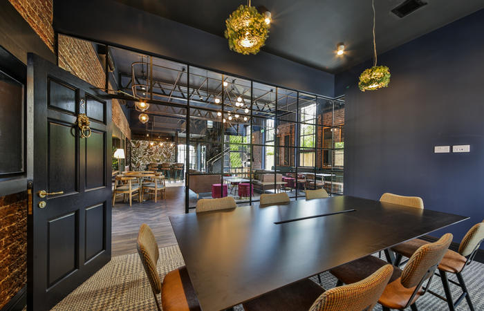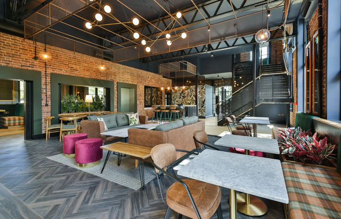 Another major design driver was the building’s rural aspect and the design therefore strives to make the most of views over the historic surrounding countryside, as well as bringing the outside in via natural references and creating a rich, textured and high-quality feel with a materials palette that includes marble-effect Hanex solid surfacing and brass detailing. Upholstery fabrics include textiles that nod to British rural tradition, such as checks and tweeds, whilst colours span a whole nature-inspired autumn-to-winter palette and feature greys, browns, rusts and moss greens, with bursts of berry brights and large-scale, nature-inspired print wallpaper on opposing feature walls at the ends of the ground floor.