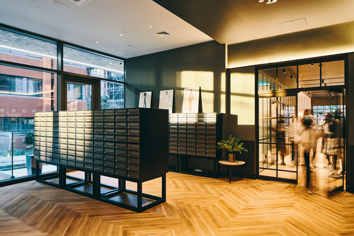 ‘We worked with the building’s unusual angled glazed box base to make the most of views in and through the amenity space’ 74 Associate Bianca Yousef commented. ‘At one end of the building, the ground floor only can be seen, whilst, as the street slopes down, passers-by can also see into the lower-ground-floor gym space at the far end.’
