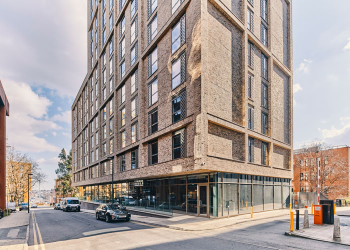 Symons House, designed by Leeds-based architectural practice Cunniff Design, takes the form of a reverse L-shape building, with seven storeys located on its lower horizontal plane and twenty-one on the vertical upright section.