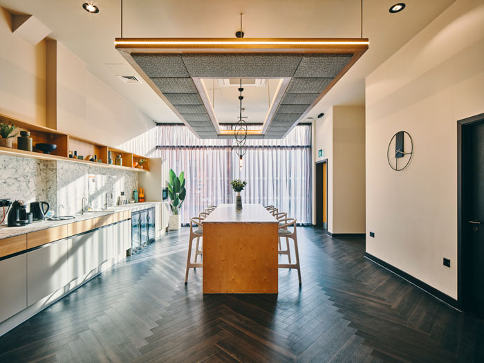 The full suite of amenity spaces includes a reception lobby, back-of-house space, study lounge, meeting rooms, library, communal kitchen, toilets, cinema room, gaming lounge and gym, as well as an 8th floor private dining room. The material treatment for the scheme includes bronze-finish crittal-style doors and glazing, which respond directly to the external metalwork, plus a double-dado rail treatment that further ties into the door and window levels. Large, rectangular lighting rafts in bronze-painted timber continue the metallic allusions.