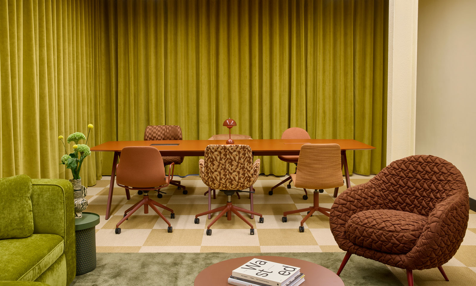 Of primary importance was the promotion of colour and the vast number of options. For example, a fabric swatch wall is a sales tool which also works to elevate colour within the space. A meeting table with different chairs upholstered in a tonal way, shows textures and is a vibrant, design-led feature used daily by the team and clients.