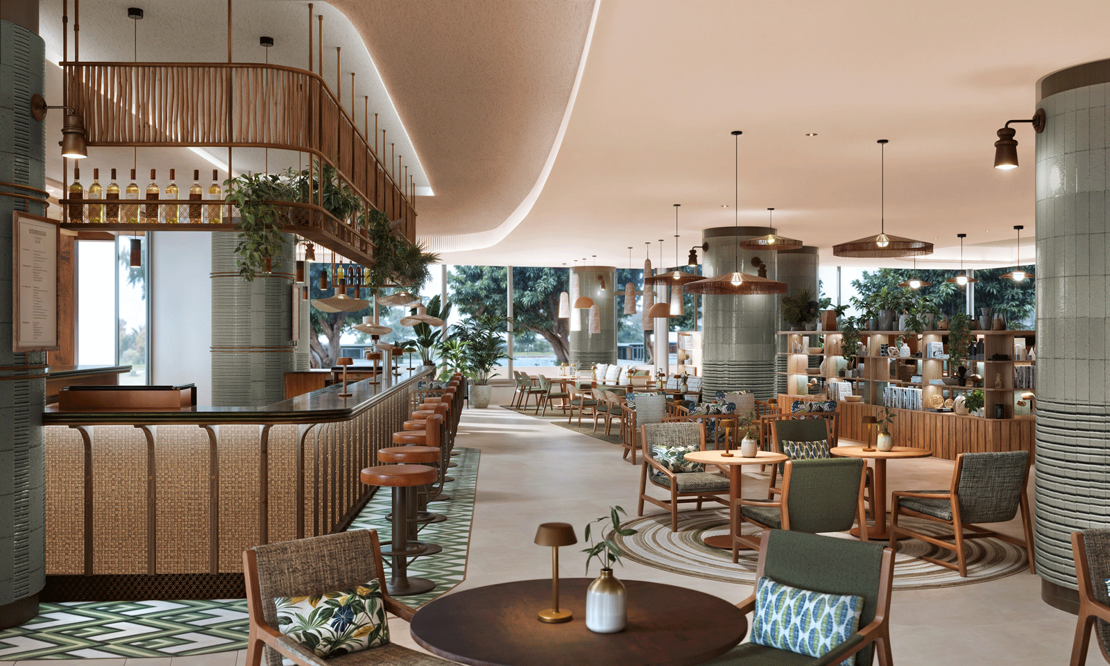 The lobby is set for a dramatic overhaul, anchored by a centrally located bar, biophilic design elements, and a curated selection of artwork that together create a vibrant yet welcoming atmosphere. Dining and social spaces are also being revitalized in collaboration with Streetsense, with standout features including an octagonal terrace bar, interactive cooking stations, and an al fresco dining concept that pays homage to the region’s rich culinary heritage.