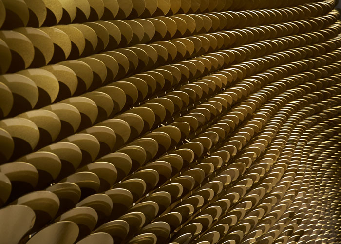 The 3200 brass pieces were laser cut and then individually machine-bent before being slotted into the vertical contoured ‘ribs’ that make up the undulating shape of The Veil. We are delighted that the client took the risk and pushed us to create something that went beyond sculpture into something that functioned so well for the space on multiple levels.