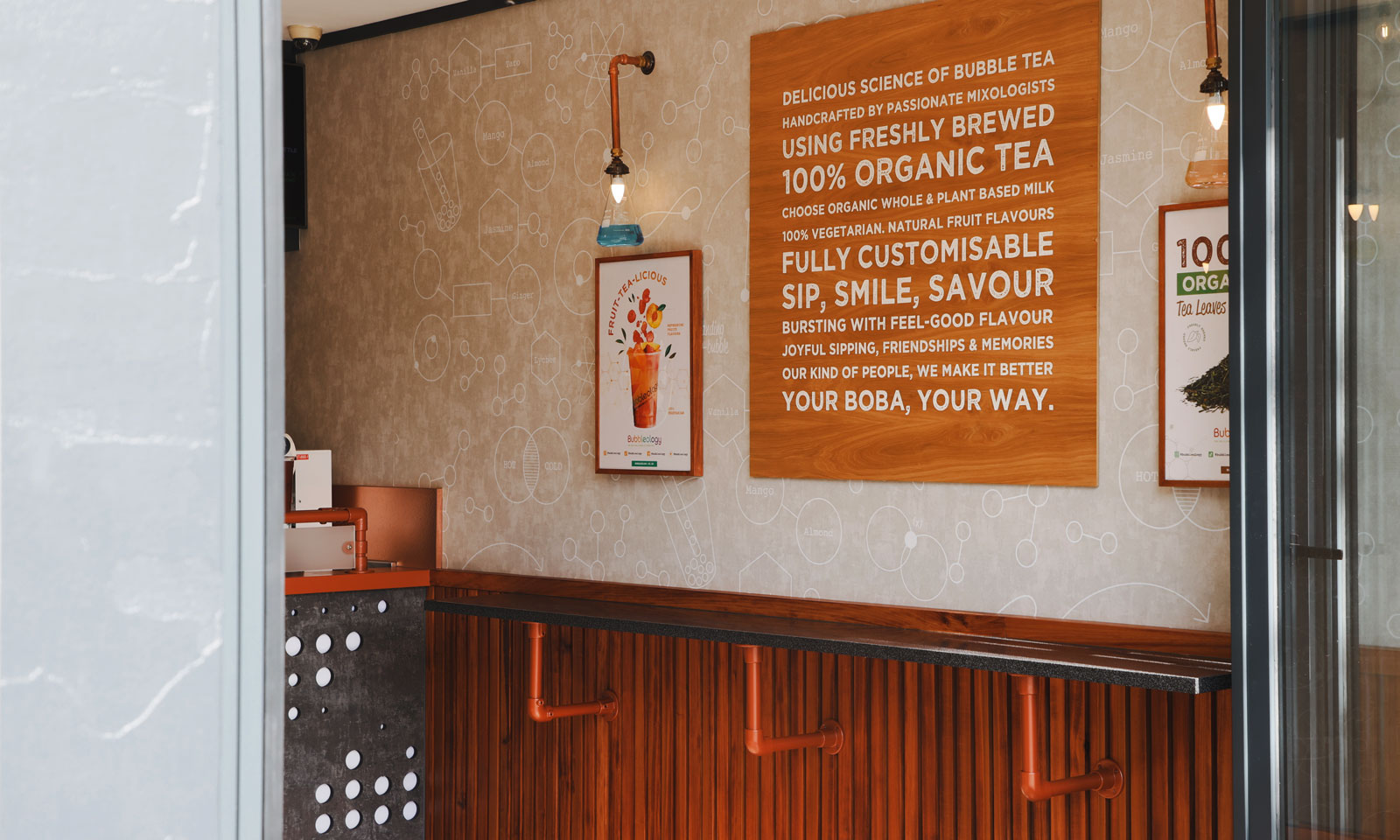 The redesign aims to captivate Bubbleology customers by enhancing their bubble tea experience from the moment they step into the store. The concept focuses on integrating elements of the bubble tea making process into the store design. With strong nods to the science behind the crafting of bubble tea throughout the concept which plays beautifully with the softer and warmer notes within the seating areas.