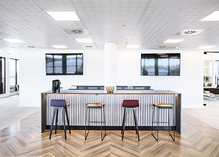 On each floor, Amtico Carpet was used to help identify zones, with the neutral tones of Check Melton and Check Broadcloth creating a base for formal meeting areas, and the colourful pattern of Stringworks Kaleidoscope, from the String Theory collection, highlighting an informal yet functional space to sit with clients.