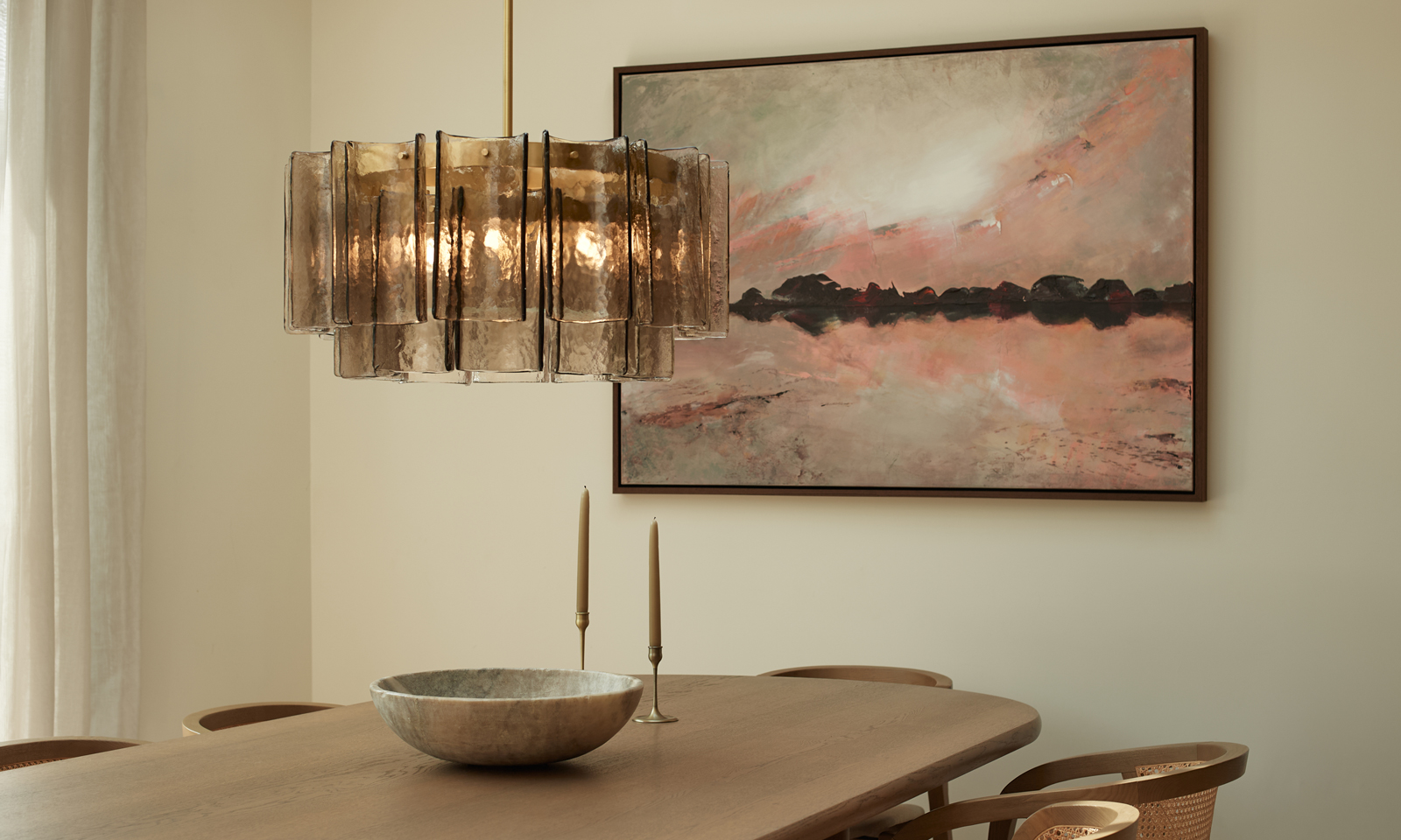 The palette spans light brown and smoky neutrals, designed to sit quietly within a space while still holding presence. Satin Brass metalwork adds a sense of refinement, bringing warmth and contrast to the softly textured glass.