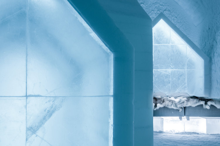 Blue Houses, Interior design by Kauppi & Kauppi for ICEHOTEL. A minimalist tribute to houses, dwellings and tranquility – a deluxe suite built of ice and snow.
