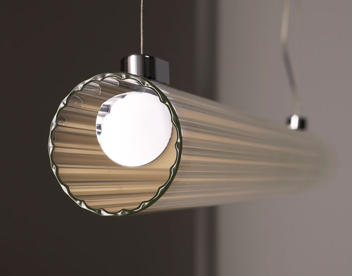 The io Pendant light takes inspiration from the fluted detailing of the ancient Greek Ionic pillars. Using the unique production process of gravity-fed glass extrusion, io Pendant takes a circular 2D design and extrudes the glass downwards to create a perfectly ribbed cylindrical form.