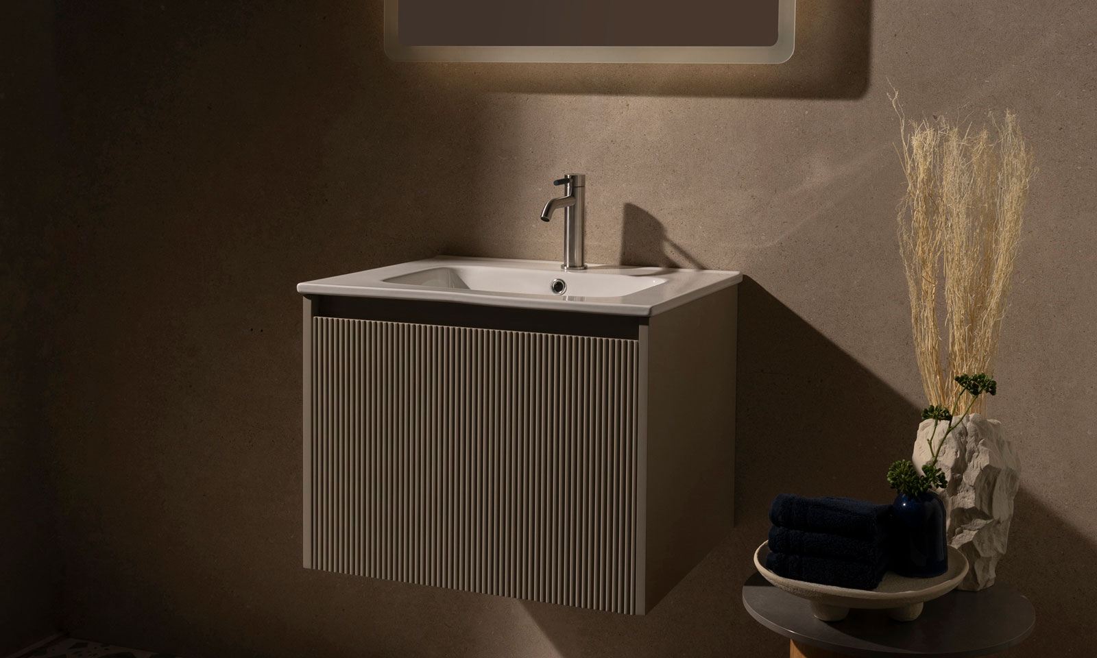 Stunning in its simplicity, the versatile Studio 316 range also includes vanity units with elegant, slimline ceramic basins that integrate seamlessly with the furniture. Featuring the same fluted finish as the mixers, the vanity units are available in Matt Navy, Matt White, Oak Wood and Soft Grey to provide a cohesive design and enhance the modern aesthetic. They come in four versatile sizes of 450mm, 500mm, 600mm and 800mm.