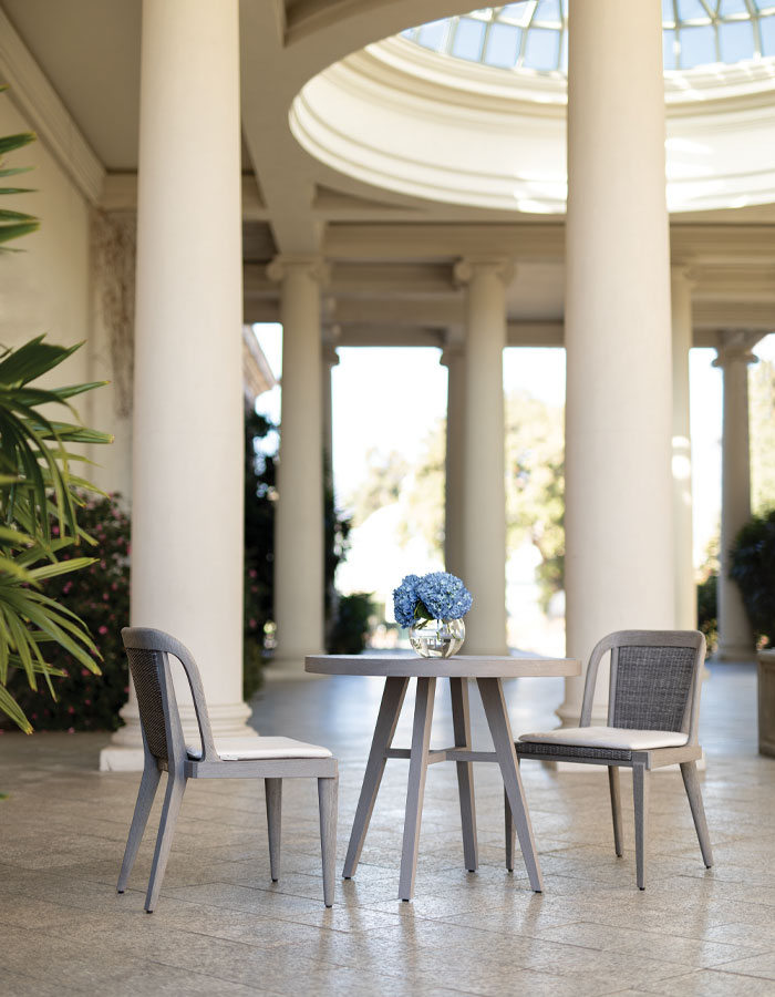Expertly crafted in teak with a Driftwood finish, the impressive dining, café, and side tables are topped with an intriguing textured Alabama ceramic. The collection’s sculptural modular and lounge pieces pair durable teak frames with beautifully woven JANUSfiber in Smoke, creating a rich display of deep gray hues stippled with light and dark tones. Ample cushions for the seating elements provide a luxurious, comfortable sit. Rock Garden’s masterful balance of light, proportion and clarity creates a profound impression whether situated in an urban apartment, rustic outdoor patio, or a luxurious seaside resort.