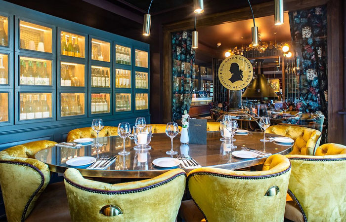 Separate dining areas for private parties are also available. The design is brought together by the soft textures of the upholstery, as well as contrasting metal and tiled elements.