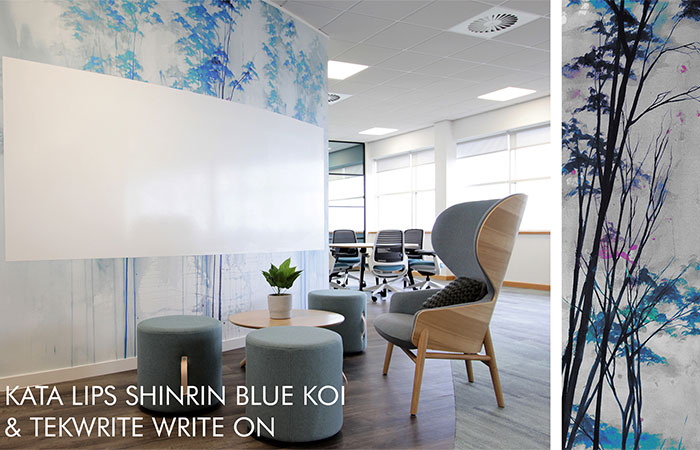 Tektura’s Kata Lips Shinrin Blue Koi wallcovering and Tekwrite Write On