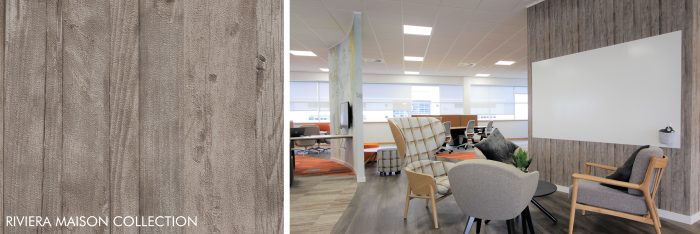 Natural surfaces take centre stage using Tektura’s Riviera Maison collection wallcovering. With a warming wood texture, the effect brings a softer side to the office interior.