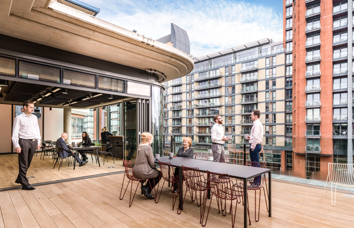 The best places to locate a workplace café are either on the ground floor, specially if people rely on grabbing a great coffee on their way into work, or else, if you have the luxury of a roof terrace or open area to spill out on, on an upper floor, as with this part of the BCO-award-winning scheme we designed for Muse Developments in Salford.