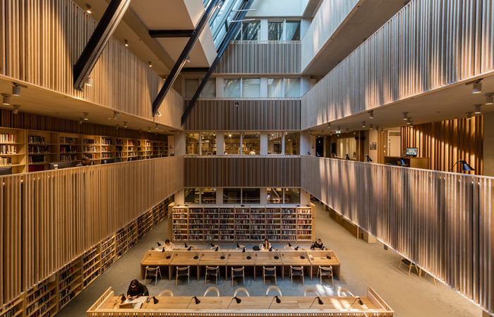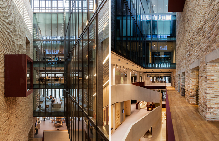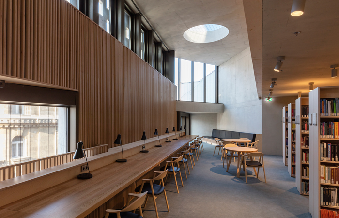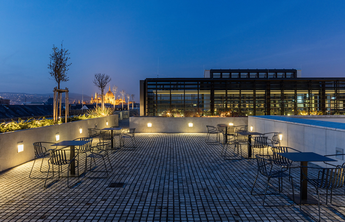 The new building on Nador Utca forms the main entrance to the University. It houses the library and learning commons over a multi-purpose auditorium and conference facilities. The adjoining building is radically refurbished to provide a covered courtyard for public events, with a business school and teaching spaces at upper levels. A roof garden straddles both buildings to provide views over the city skyline.