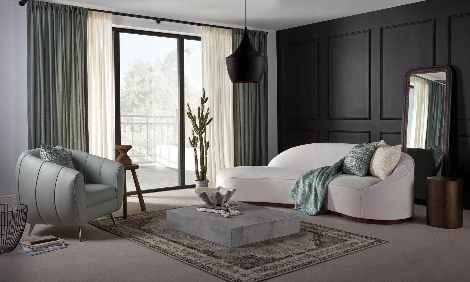 Sheer Nouveau Pearl & Sage. Sofa in Monza Fog. Chair Chase Erwin Leather Collection. Cushions in Coco Sage & Pearl, Throw in Evora Mint