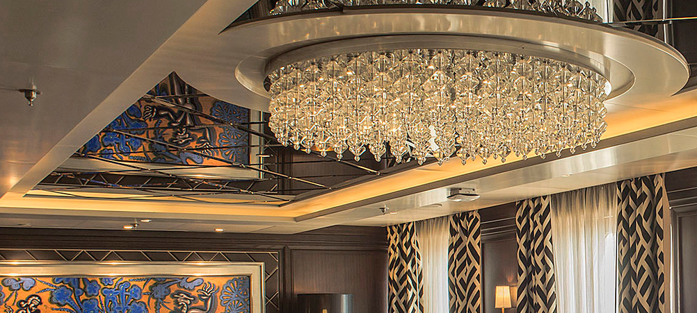 The main lighting focal point is the spectacular chandelier which hangs in the atrium between sweeping art deco staircases, intricate columns and sculptured architectural features. With a diameter of 3metres and a drop of over 4metres, the chandelier features over 6,000 individual high quality crystal octagon drops, each one attached to a chrome wire frame to prevent movement and vibration when the ship is under way. The drops are suspended from a finely engineered custom brass frame.