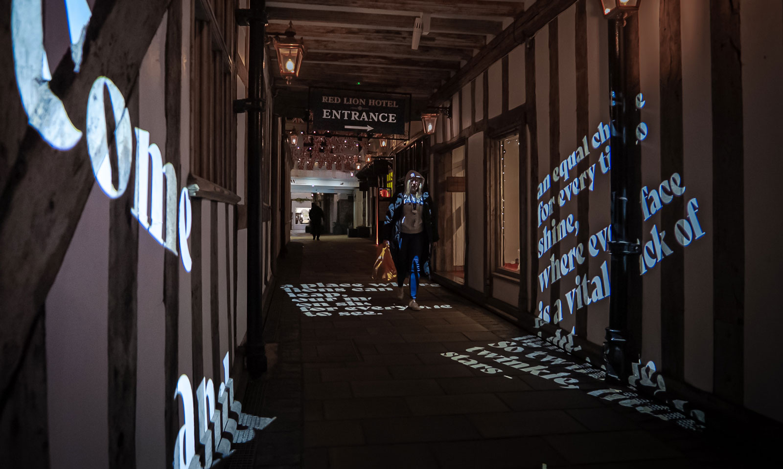 One of the main entry points into Lion Walk is via a beautiful timber framed outdoor walkway which runs through the Red Lion hotel, a fifteenth century Grade 1 listed coaching Inn. To highlight this entrance, f.r.a. created impactful signage featuring a new brand identity designed by DS Emotion and installed dramatic lighting that highlights its location, drawing people in as darkness fell.