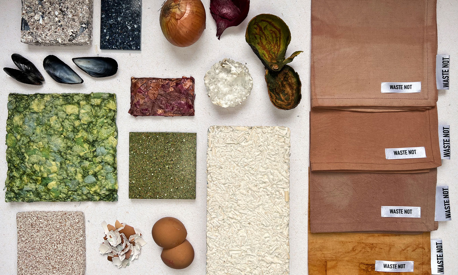 By now we’re well aware that waste plays a significant role in the effects of climate change, not least in the manufacturing of our materials. The same can also be said for food, which is something that Ella Adiki Nartey’s project WASTE NOT looks to tackle head-on. Taking egg and mussel shells, along with egg boxes, organic food waste and biopolymers she has created an entirely new material palette. The reasons behind the project are clear, as Ella explains:
