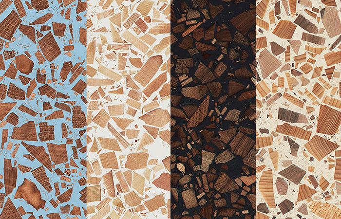 Then a material librarian, Taylor already understood the unique properties of wood and our natural desire for it’s unique grain. But in discovering that large sections of any given tree are deemed unusable due to branch junctions and knots, he set about a creative process of experimentation whereby he literally smashed the blocks to create aggregate. This natural and grained aggregate is then set into resin to form large terrazzo panels, each one completely unique and yet uniform, now produced in volume in partnership with fellow UK surface manufacturer Solomon & Wu.