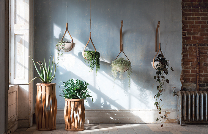 Others have worked with wood right from the beginning. Tom Raffield shares an interest in the ability to shape, form and bend wood, creating attractive objects inspired by nature – a fitting approach given the origins of his material of choice. Indeed, whilst his contemporary lighting and furniture pieces push the boundaries of wood using traditional techniques and modern technology, the affinity to nature is a cornerstone of his practice. Not only does he allow the raw beauty of wood and its grain to simply be, or use naturally inspired processes such as steam bending but also the curved and twisted objects he creates bear reference to forms found in nature. Products such as the steam bent planters of the Green Range take this one step further by including plants directly within them; nature meets nature. This leaning towards biophilic design principles is a deliberate one as Raffield explains: