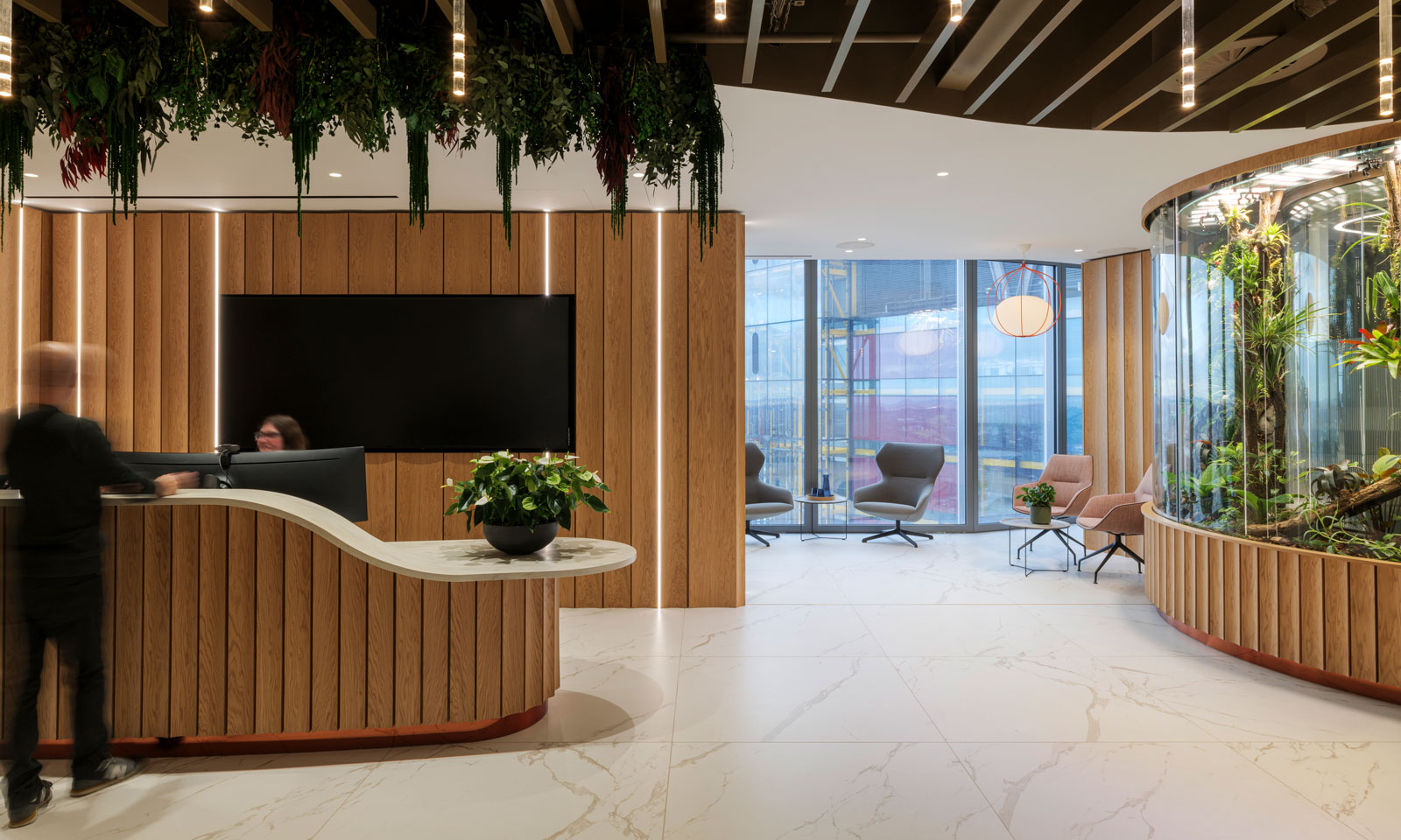 To the right is a floor-to-ceiling semi-circular terrarium, featuring plants native to Bermuda and created for the scheme by Grow Tropicals. This was a very technically-challenging installation with, for example, an inbuilt misting system, reverse osmosis filtration and a deep base to hold all the necessary technology. Sliding doors allow for monthly maintenance access. The terrarium is in a bronze finish to the top and bottom, with vertical ridged timber panels directly below the glazed frontage. The scheme throughout features planting that is all real and either naturally-preserved or freeze-dried, with its integration developed with planting consultants Exubia.