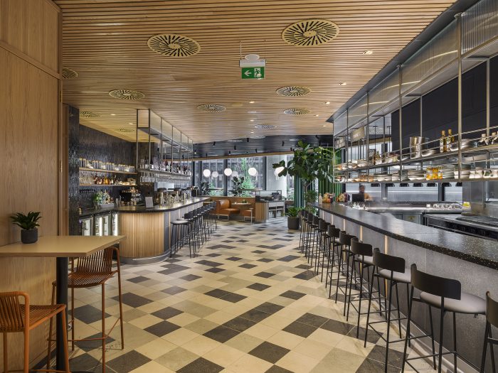 Custom-designed lighting also plays a pivotal role, creating a warm and intimate area for guests while the open kitchen adds a culinary theatre to the restaurant. Energy and vibrancy are created within the main space through the open kitchen kiosks – providing an honest engagement between the culinary concepts and the guests.