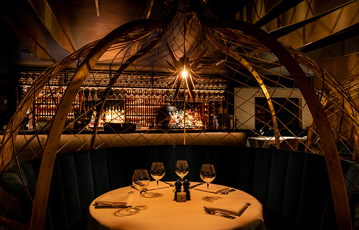 A sculptural helical staircase crowned with a striking chandelier of knitted wire orbs captivates guests as they enter the restaurant. The bespoke lighting creation created by Brighton based artists Steven and Amanda Follen references a subaquatic feel, which has become a dominant design narrative throughout the scheme.