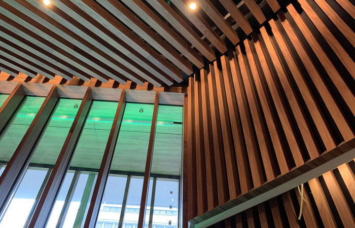 Each slat individually designed…EE Smith believes the project would have taken double the time to complete without the standout installation process they have; this merged with the unique nature of the timber products used helped to streamline all aspects of the job, right from production stages.