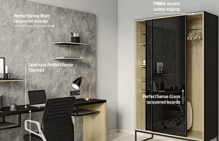 The high reflectivity of an ultra-gloss surface helps to make rooms appear lighter and larger. The luxurious, glass-like finish provides a contemporary look that is otherwise difficult to achieve. Available as PerfectSense Gloss UV Lacquered MDF boards, the range is suitable for vertical applications.