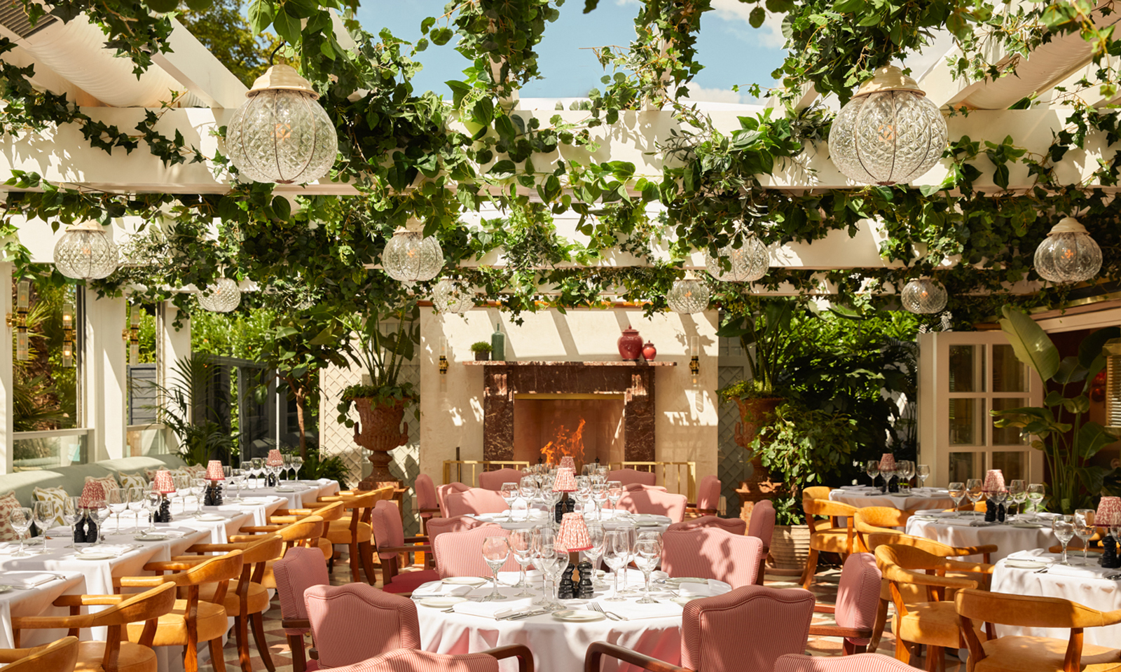 The restaurant features an impressive indoor-outdoor dining terrace that includes a retractable roof, allowing the space to be used all year round. The white pergola strung with crystal pendant lights, an open fireplace and an abundance of lush planting is reminiscent of a glamorous Italian garden.