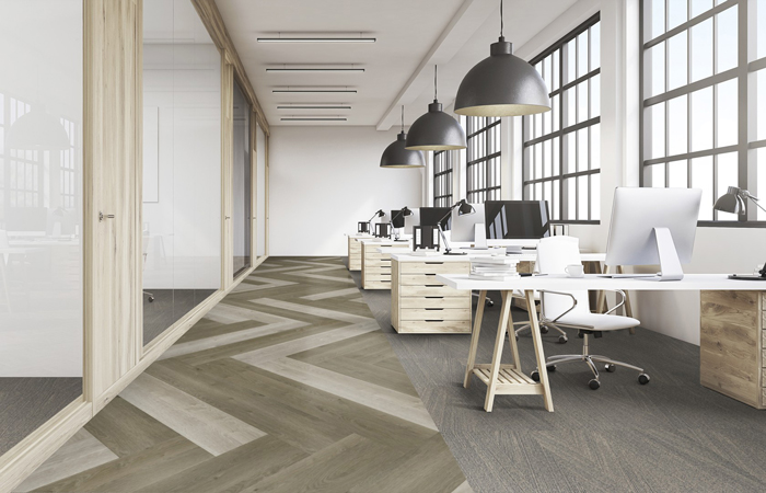 Well-being is at the core of Milliken’s design philosophy and directly informs their latest LVT collection First Call. High noise levels have been shown to increase stress levels, which in turn can have a big impact on workers’ overall health and wellness. Sound absorption has been dramatically improved with First Call LVT through the use of the FlexForm SoundTM cushion layer, created by Milliken to radically reduce contact noise and improve acoustic performance. This pioneering cushion layer can diminish impact sound by up to 16 decibels (compared to 5 decibels for standard LVT).