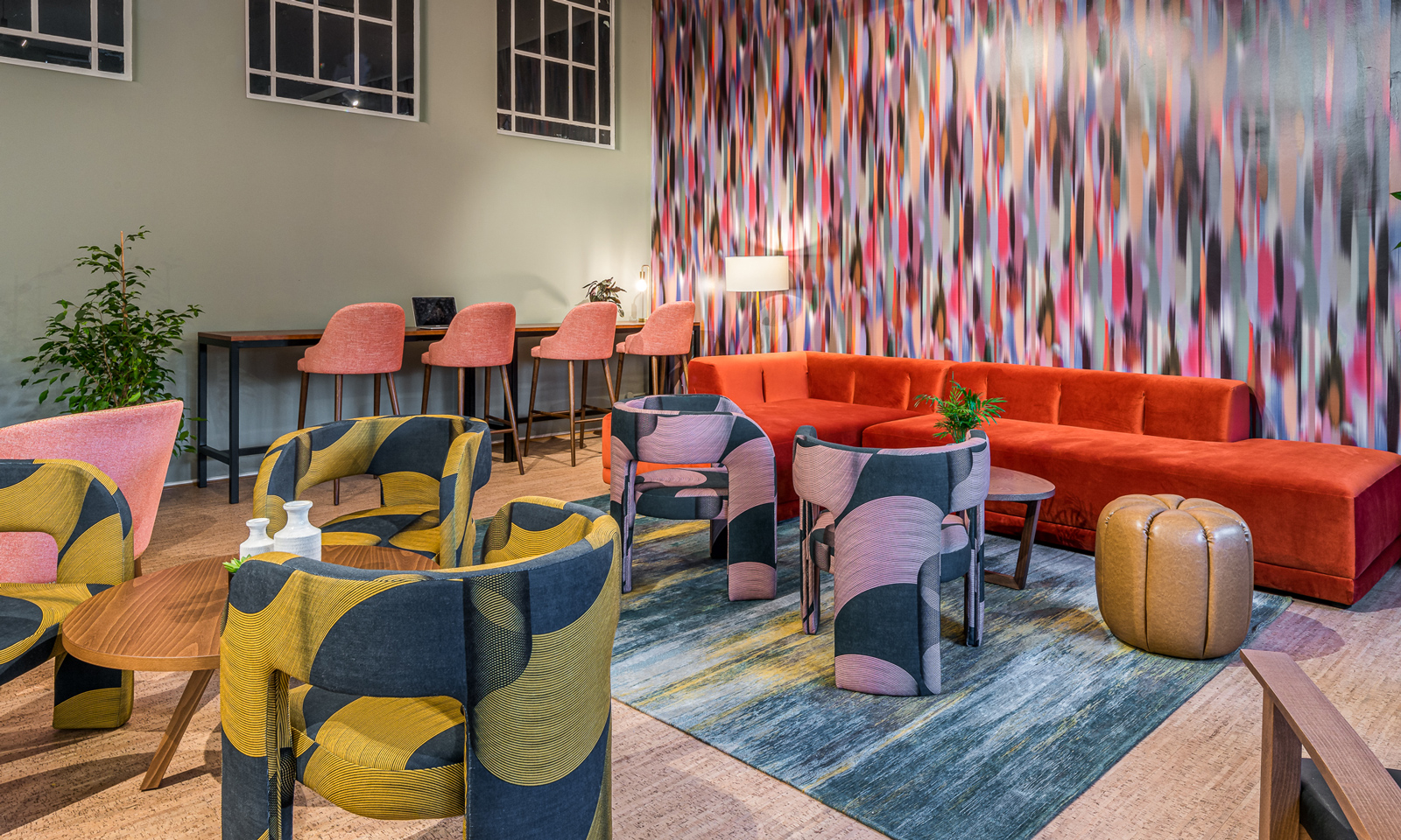 This project also brings an Op Art-inspired pattern into the mix – giving a new and unique dimension to their Camelia chair. While the fabric uses more subtle shades, the striking design makes a strong statement. The team loved the clashes of colour and patterns and think it sets the tone for a space that’s fun and not just functional.