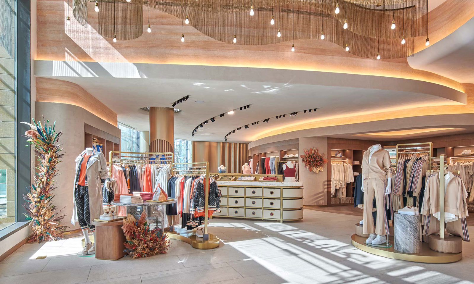Generously sized fitting rooms also elevate customer well-being, with purposefully designed lighting that ensures people feel comfortable. Other thoughtful details include charging points, shelves for bags, shoes & jewellery, and 360-degree mirror sight lines. Wrapped in padded upholstered walls with a statement full-height triple mirror, the design is luxurious and complements the apparel collection.