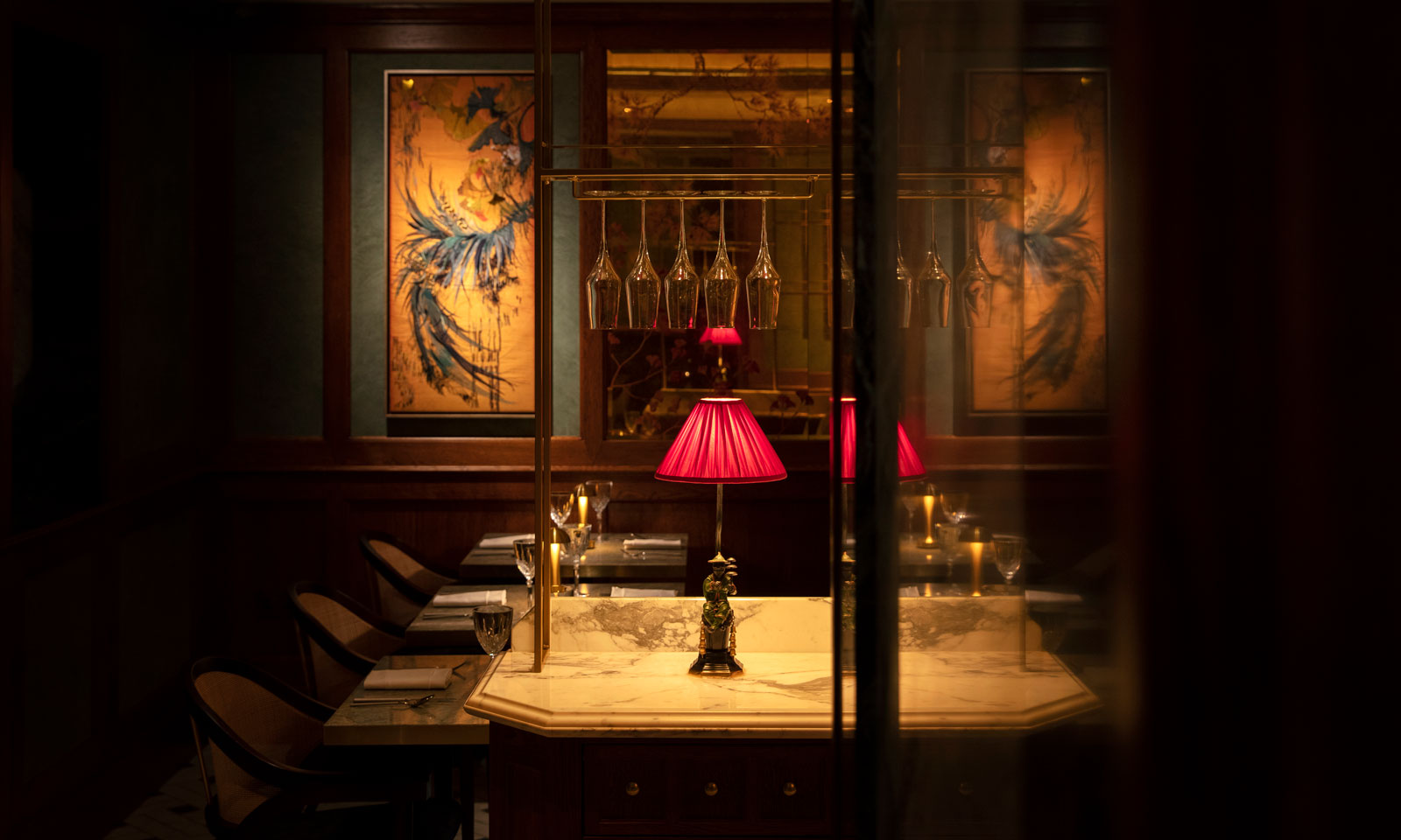 The intimate 58-seater restaurant has a stunning blend of green hues and lush red lacquer enhanced by a verre eglomise made by Anna Didik in South London, referencing the designs by Lara Fiorentino.