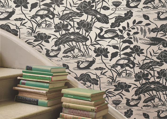 One of GP & J Baker’s most famous prints, originally designed by William Turner in 1913, shows graceful herons standing amidst lotus flowers and flitting dragonflies and has now been translated into a stunning silhouette design creating an extremely elegant wallpaper.