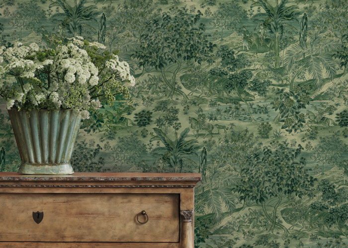 The striking colour palette ranges from verdant greens on grounds of antique pink, Chinese yellow, rich teals, and carmine and bronze to cooler delft blues and sophisticated neutrals.