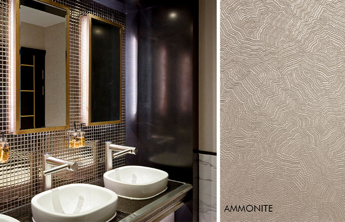 In the restrooms, mirrored tiles and black laminate are used in conjunction with Tektura’s Ammonite wallcovering. All the Tektura wallcoverings selected are scrubbable and can be cleaned with diluted bleach.