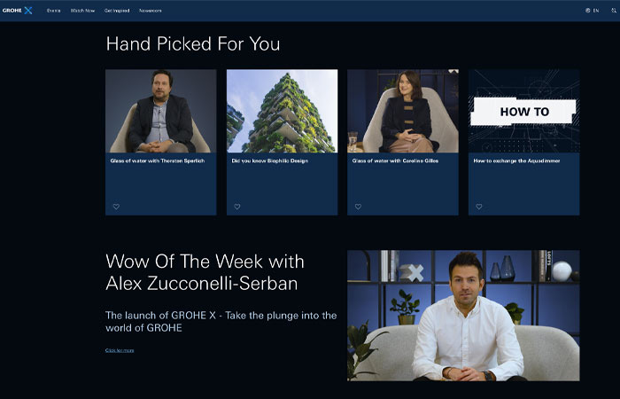 Tailored to the needs and interests of the respective target groups, a customised programme of content is available, which includes how-to videos, inspirational articles, and 360° virtual rooms that allow visitors to immerse themselves in the latest product highlights. In addition, there are exciting video formats such as ‘A Glass of Water with…’, in which various GROHE experts offer behind-the-scenes glimpses of the global brand, or ‘Wow of the Week’, in which a particularly inspiring project or topic is presented each week. While visitors to the brand hub can explore the world of GROHE on their own, GROHE X also opens up new ways of interaction. Business partners can use the platform to make appointments with their sales representatives and thus exchange information directly about the innovations that have just been introduced.