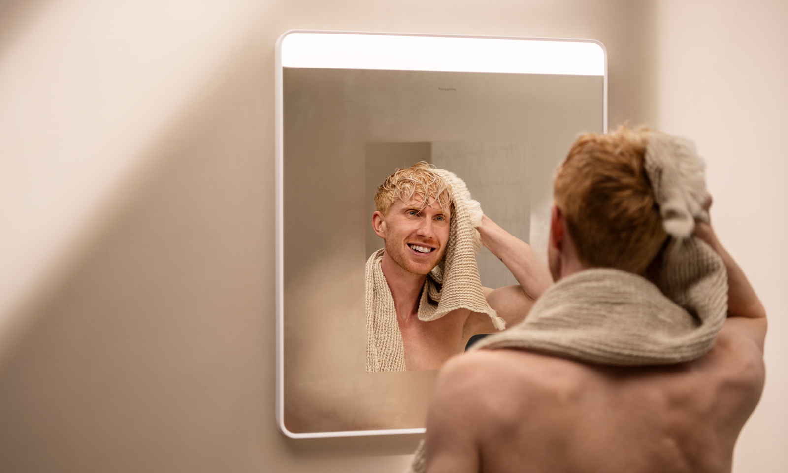 Reflecting your own personality: hansgrohe Xarita Lite mirrors work harmoniously with the hansgrohe washbasin in terms of shape and colour, and also impress with their ease of use and enhanced durability.
