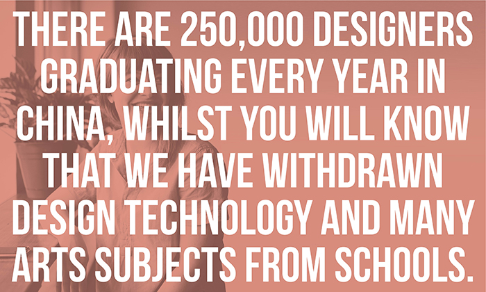 ‘I heard today that there are 250,000 designers graduating every year in China, whilst you will know that we have withdrawn Design Technology and many arts subjects from schools. I think that this puts China very far ahead of us in terms of being able to be a design powerhouse. Our good fortune is that being capable of technical design does not make you creative or original and it is recognised that the skill set in China is very adept at copying rather than creativity.