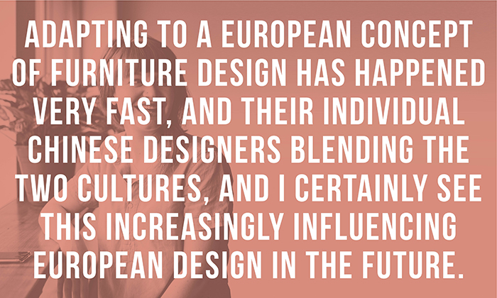 Chinese manufacturing skills have not always been associated with cheap products, this is very much a misconception of modern day Europe. Furniture design has been specific to their cultural norms and requirements. Adapting to a European concept of furniture design has happened very fast, and their individual Chinese designers blending the two cultures, and I certainly see this increasingly influencing European design in the future.’