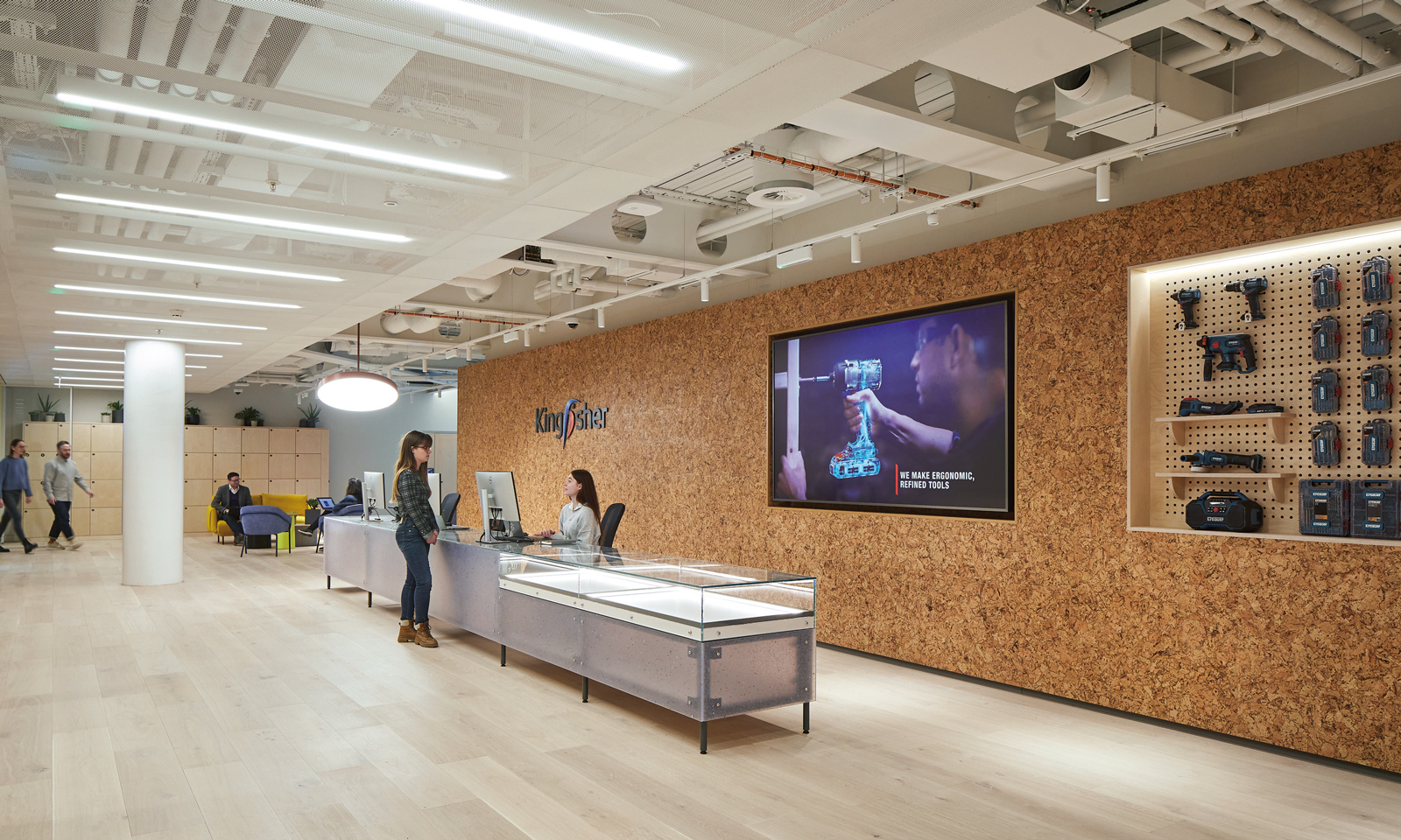 A primary objective of the new Kingfisher office was decarbonisation, specifically reducing embodied carbon emissions from the interior fit-out through careful consideration of: raw material extraction, manufacturing and processing, transportation, installation of all building materials, replacement of materials, end of life, disposal and recycling.