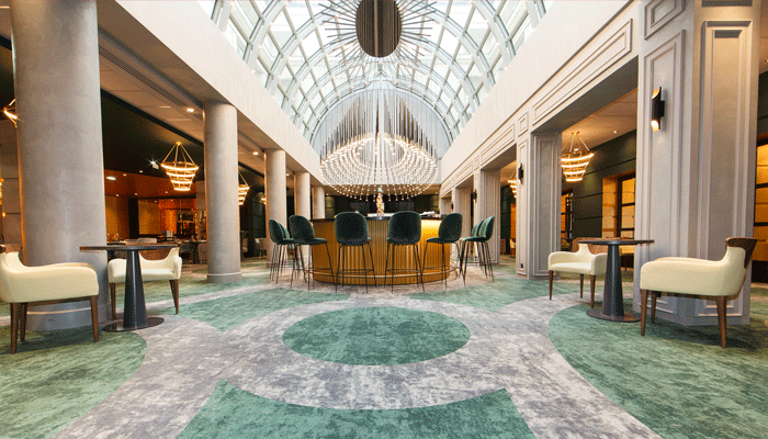 BCFA member, Ege Carpets, were selected to supply for the hotel renovation. In line of the theme of the Gardens of Versailles, a custom designed carpet with rich emerald-green colour combined and a concrete inspired texture created an elegant and luxurious setting in the hotel’s reception and lounge areas. The royal ambience of the carpet design reflects the famous lawn pattern of the gardens and compliments the rest of the interiors perfectly.