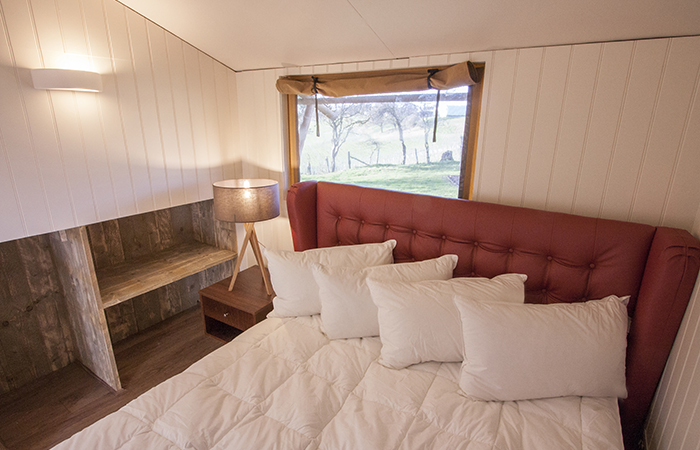 Bedrooms were fitted with a king size divan bed base and mattress finished with an upholstered winged headboard with deep buttoning in reds and neutrals. Also installed were bespoke single and double wardrobes, TV units and shelving units. The tripod legs of the restaurant tables were continued into the glamping lodges for continuity through the leg design of the coffee table, bedside and stand-alone lighting.