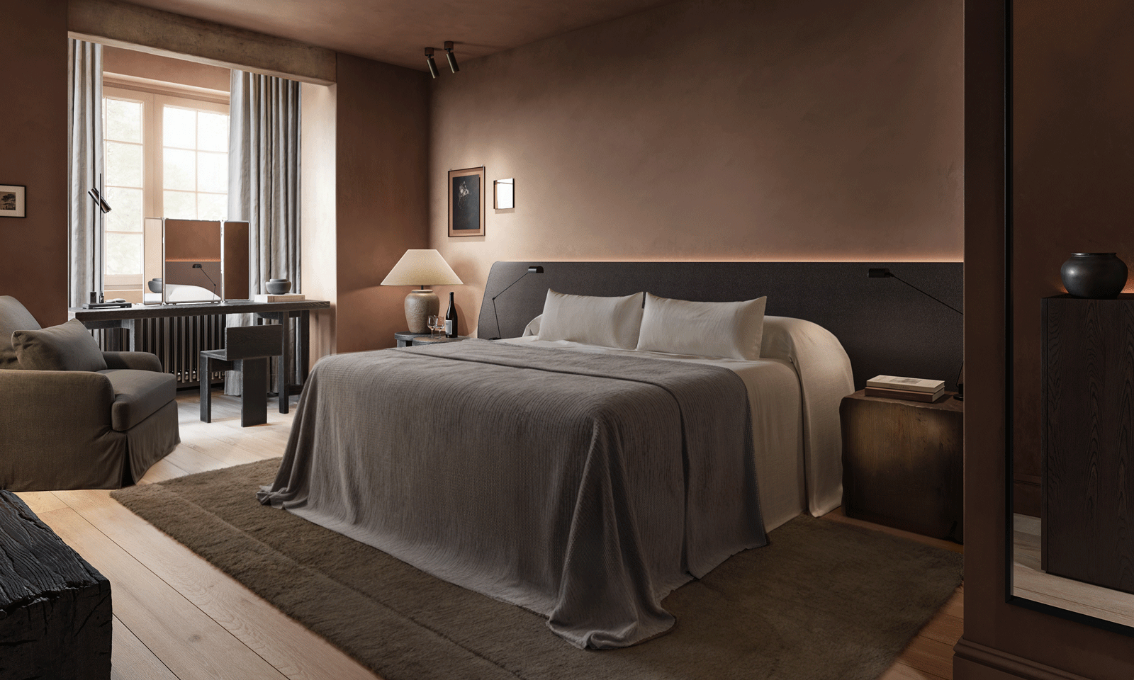 Lighting has been used as an extension of the architecture rather than a separate layer. In the bedrooms, lighting is low-lit and designed to mimic candlelight creating a warm, cocooning effect. In public spaces, YOUTH has steered the lighting design to sculpt the volume of the room, with pools of illumination guiding guests rather than flooding the space. Custom light fixtures, precise in their position, are fabricated in aged metal and add to the sense of organic refinement.