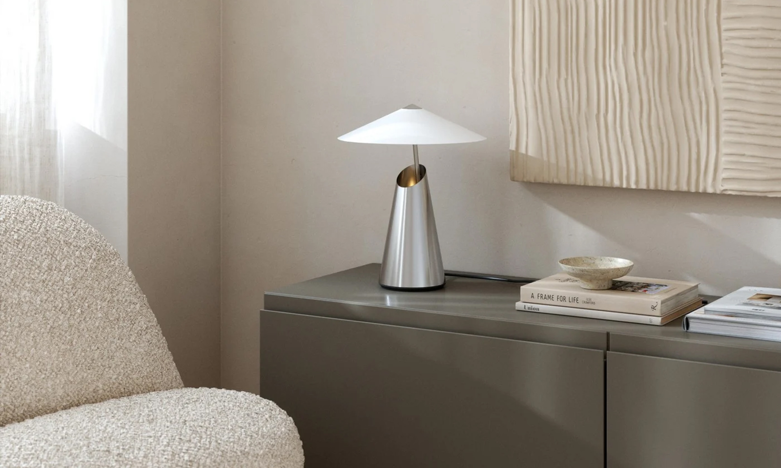 Personally, I really like working with opal glass. I can’t think of a material that gives a better light diffusion and glare free effect with a beautiful smooth colour. I also really like Fabric shades in a natural tone to soften the light output.