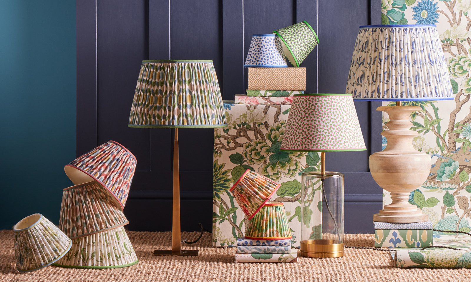 Baker’s enduring designs have been carefully re-coloured and rescaled and include iconic ‘Ferns’ and ‘Magnolia’ originally painted by textile designer William Turner in the early 19th century as well as ‘Small Ikat Spot’ a design based on the much loved ‘Ikat Bokhara’ fabric and ‘Polka Dot’ an enchanting two colour design inspired by a mid-century archive document. ‘Ferns’, ‘Magnolia’ and ‘Small Ikat Spot’ have been beautifully reimagined to a smaller scale and printed onto a linen ground. These pleated shades are trimmed with a bold contrasting edge to create a timeless, statement empire shade perfect for adding punch to any room.