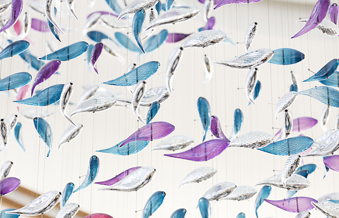 “Sea Motion is composed of beautifully arranged hand-blown glass elements with a static reef and dynamically moving elements above. I studied movements of schools of fish, different ways of schooling and shoaling. We chose the most harmonious and natural patterns and translated them into the movements of the glass elements of the sculpture.” – LASVIT designer Petra Krausová.
